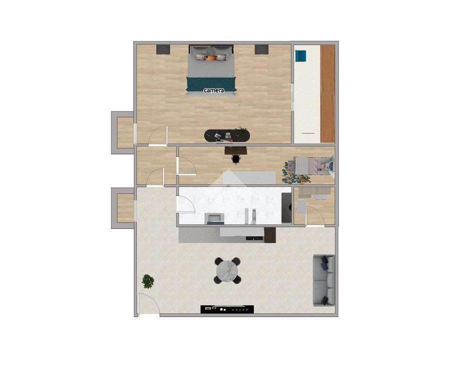 L'appartamento, grazie ad una sapiente ridistribuzione degli ambienti, offre la possibilità di essere trasformato in un comodo trilocale con un open space a vista, un confortevole bagno ed una zona notte con due pratiche camere letto. Il tutto corredato da due balconi che illuminano gli ambienti.